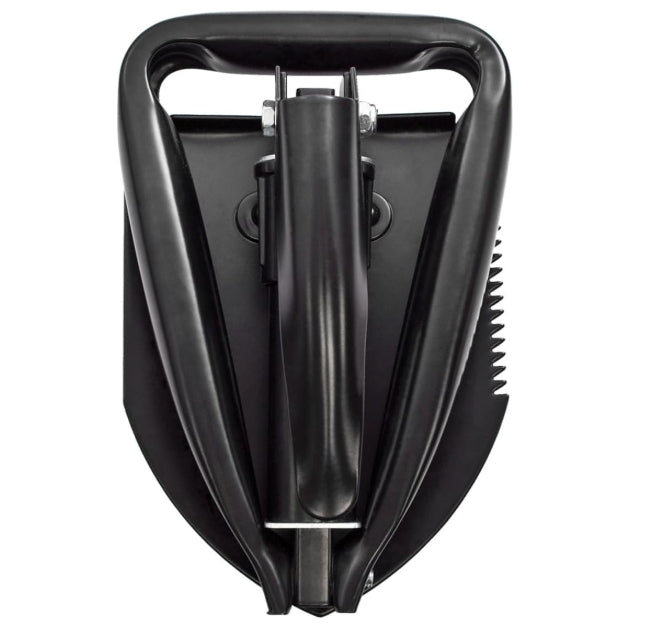 The multi-use shovel folds down to be barely bigger than your hand. 10 inches in length when folded, it takes up about the same space as a stack of paper plates. A needed tool that is easy to pack and takes up no space in your backpack, or camp kit