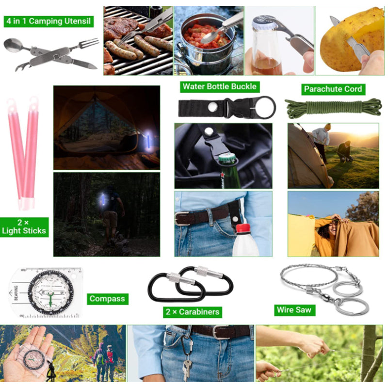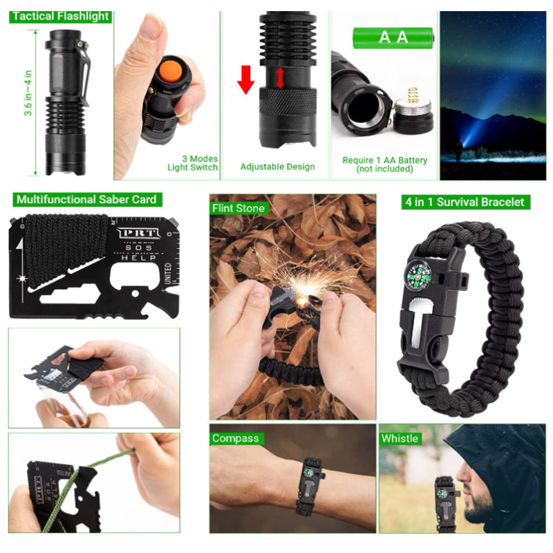 This emergency survival kit including various practical survival tools and essentials to survive in the wilderness or disasters. 14-in-1 multi-function axe, folding shovel, folding saber, tent, flashlight, fire starter. A folding knife and steel wire saw for cutting wood or bone, 4-in-1 survival whistle, compass, and thermal blanket for retaining 90% of body heat.