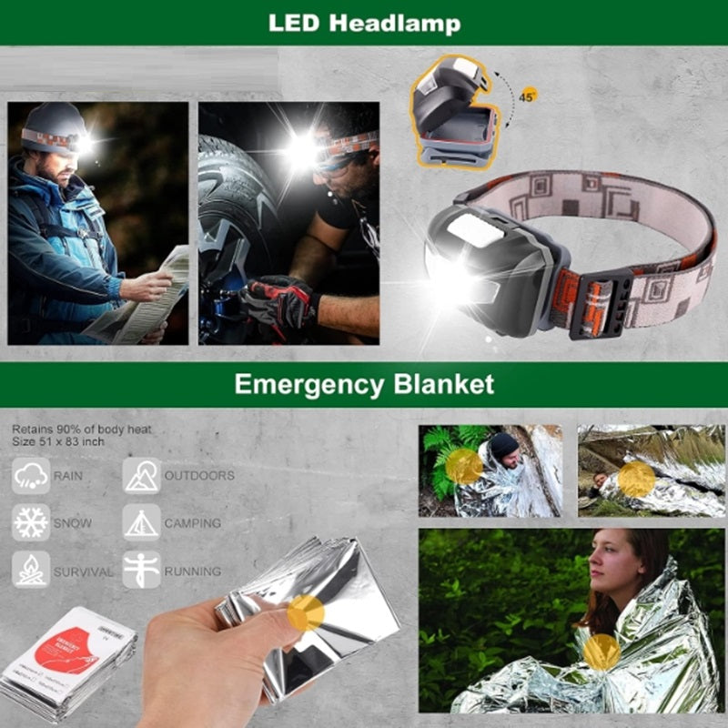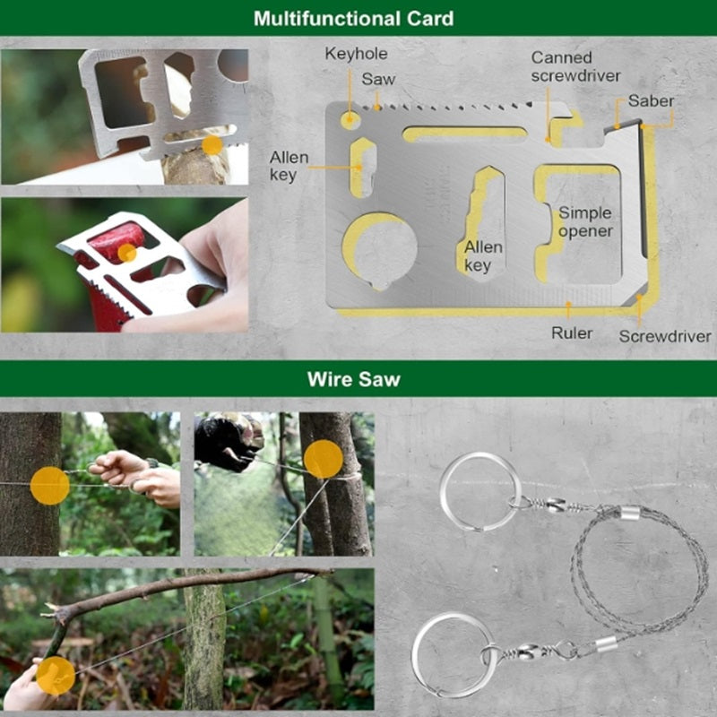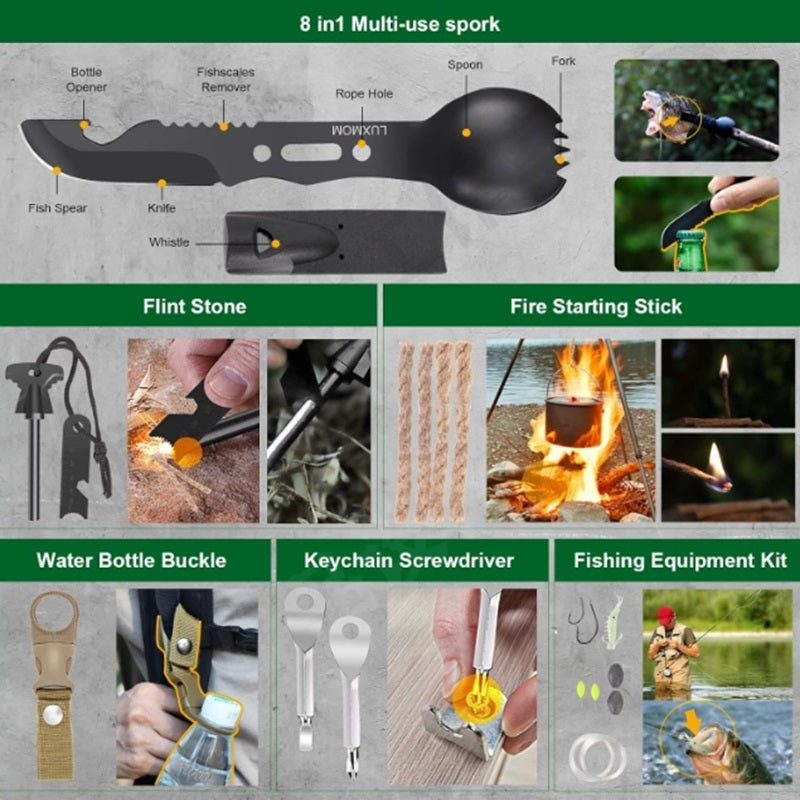 Our survival kit contains everything you need when there is any emergency situation occurs. 30 popular camping accessories are in the kit: 14 in1 Hatchet, Tactical Pen, LED Headlamp, Bottle Hanging Buckle, 8 in1 Multi-use Spork, Survival Bracelet, Fire Starter, Fire Starting Stick, Climbing Hooks, Multifunctional Card, Wire Saw, Emergency Blanket, Fishing Equipment Kit, Keychain Screwdrivers.