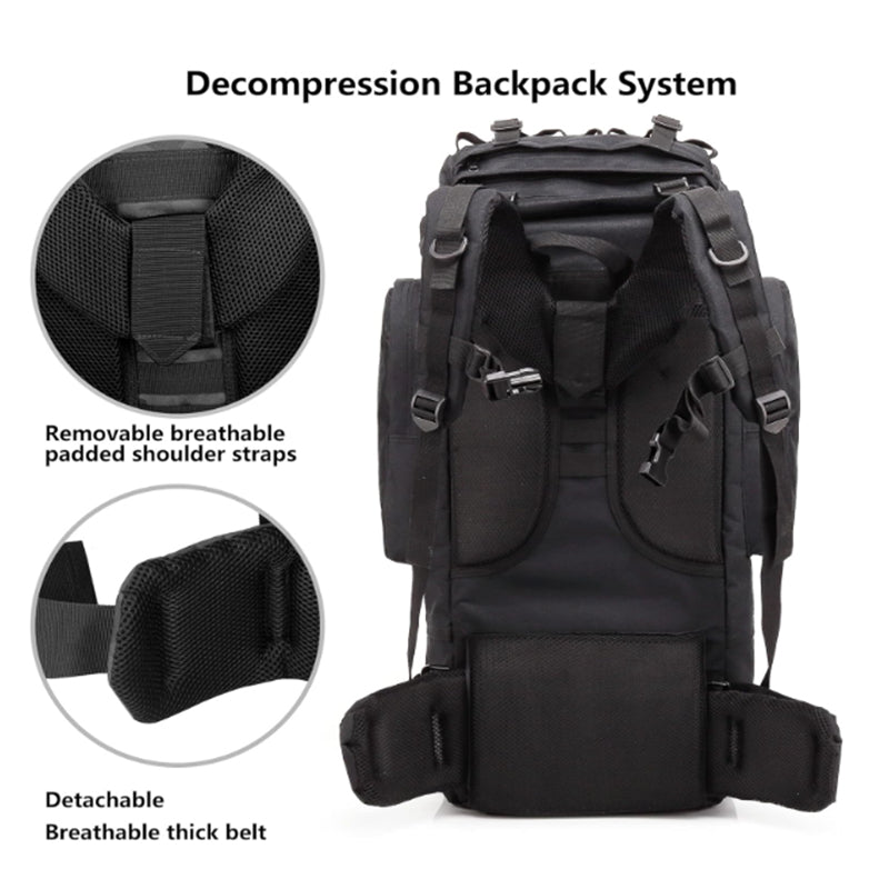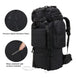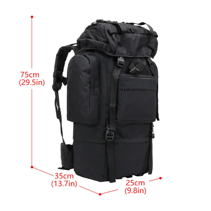 Military camping backpack size is 16.53 * 12.2 * 28.74 inch, spacious space and multi-compartment design, 56L-75L capacity backpack for men can meet your needs for a week of travel, extra compression strap making 75L backpack compact and binding your belongings.