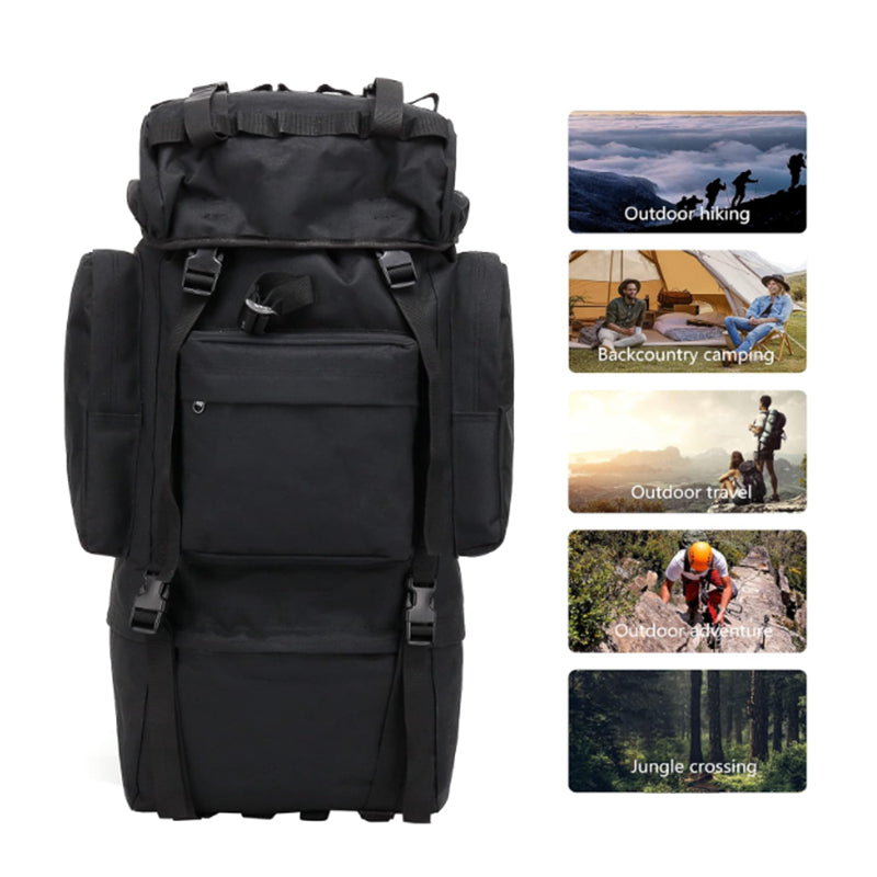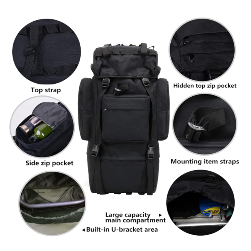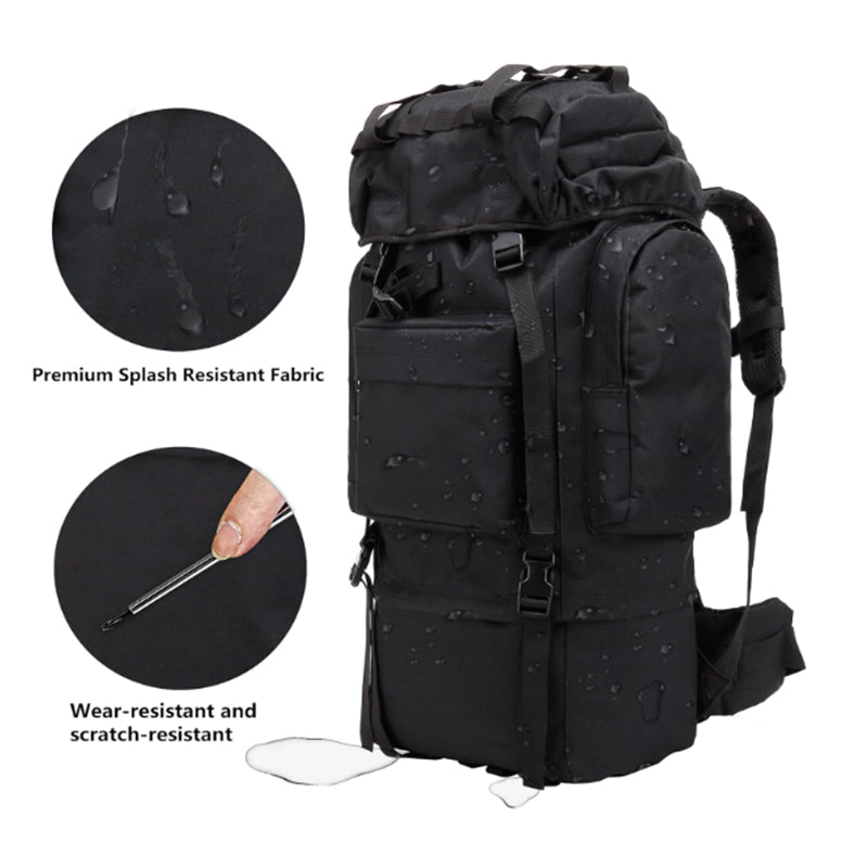 This frame camping backpack is made of water resistance coating oxford fabric, attached a rain cover in the bottom pocket to keep your gear dry, provide long-lasting durability against daily activities, a great outdoor hiking backpack.
