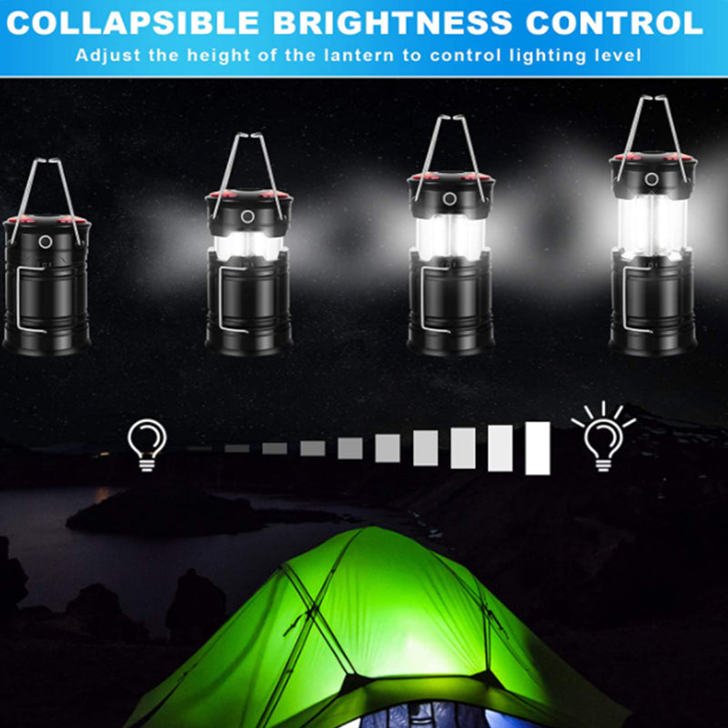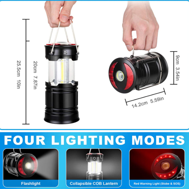 Super Bright & Large Area Brightness. 360-degree covered lighting with top spotlight provides high visibility to meet large area brightness. 4 lighting modes. Collapsible COB LED Lantern. Flashlight. Red Warning Light(Strobe & SOS light). The lantern is a vital filed survival tool and camping accessories.