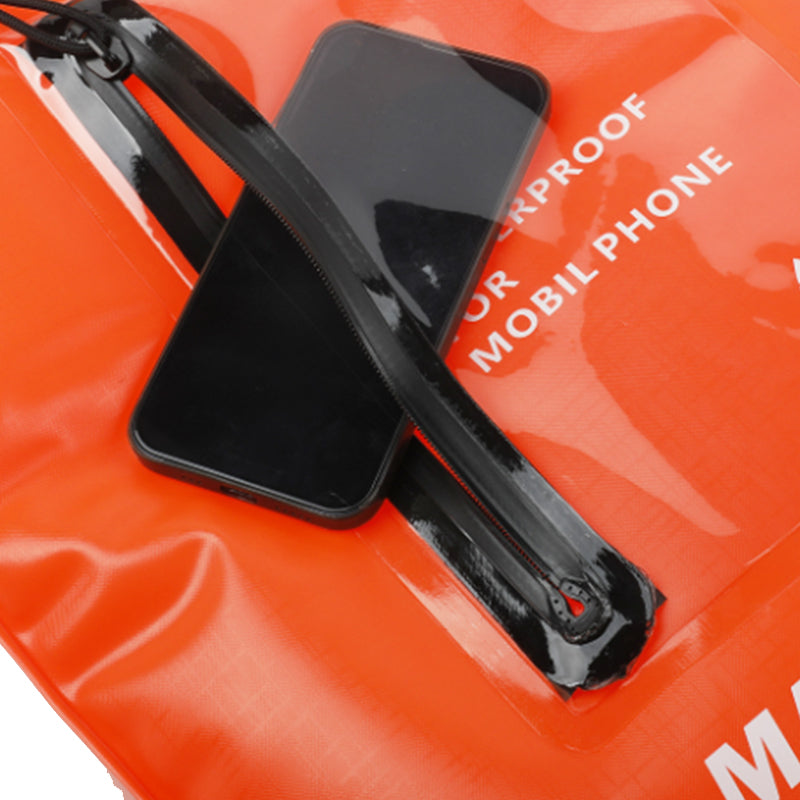 The dry bag has a zippered splash-proof pocket with a clear window that can be used to store flashlights, travel tools, or various accessories. It can also be used as touch screen which you do not need to take the phone outside of the pocket.