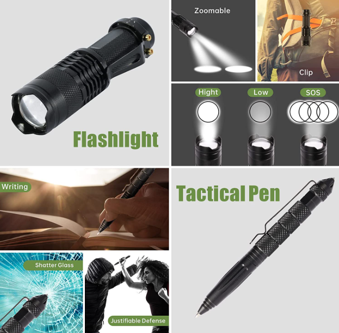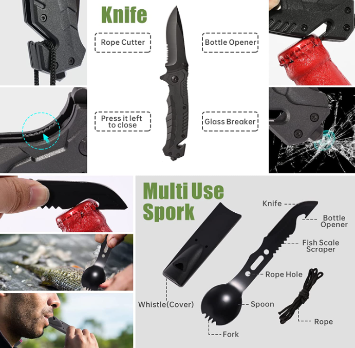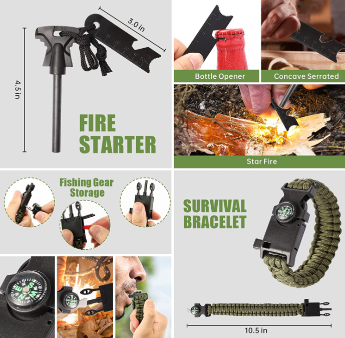 Includes a wire saw, fire starter, 5-in-1 survival bracelet, tactical pen, saber card, emergency blanket, whistle, flashlight, mini flashlight, water bottle clip, 2 carabiner, Survival knife and 5-in-1 survival bracelet.