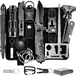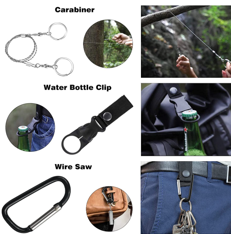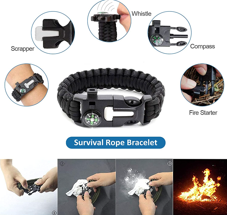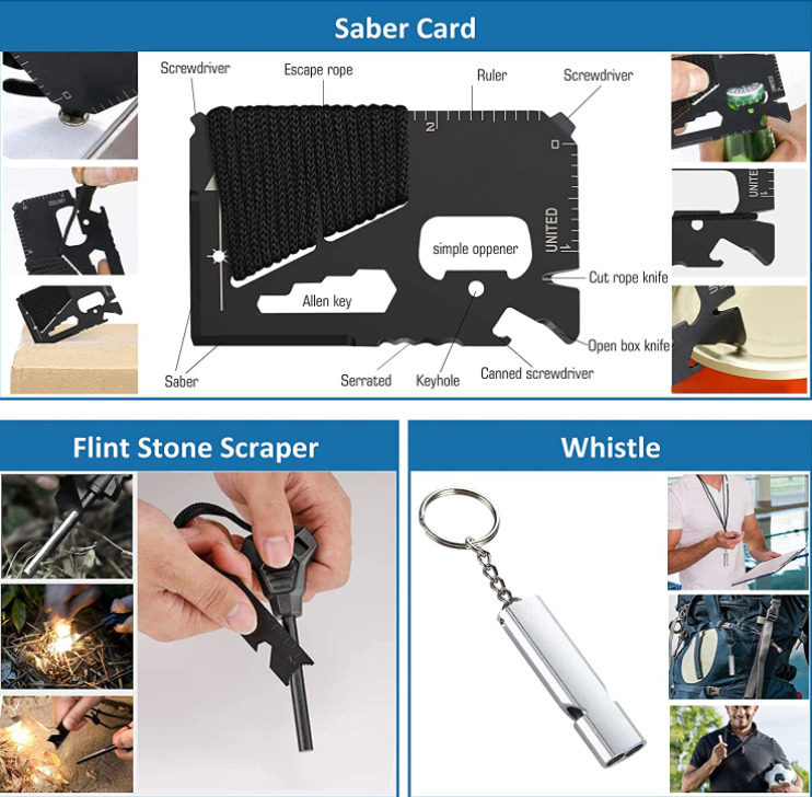 Includes a wire saw, fire starter, 5-in-1 survival bracelet, tactical pen, saber card, emergency blanket, whistle, flashlight, mini flashlight, water bottle clip, 2 carabiner, Survival knife and 5-in-1 survival bracelet.