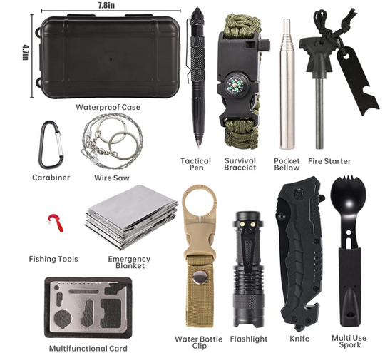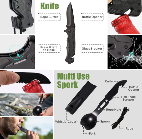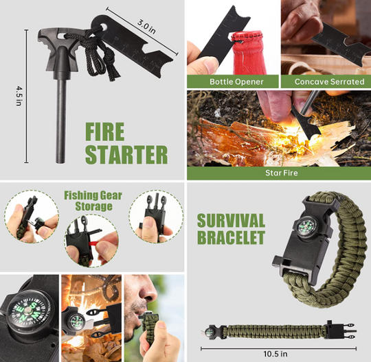 Emergency Survival Kit is necessary in your camping, hiking, hunting, fishing, backpacking, adventures, and emergency situations come with two different sets Set 1: Includes a wire saw, fire starter, 5-in-1 survival bracelet, tactical pen, saber card,...Regular price $44.99 -