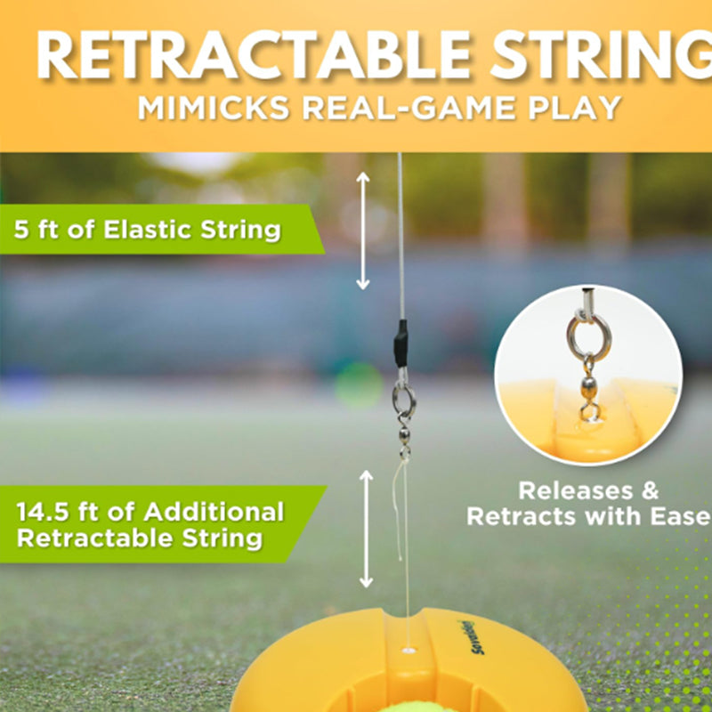 The Sovalden Tennis Trainer introduces an innovative retractable feature, mimicking real-game scenarios. The extended 14.5 ft sting will release and retract automatically throughout the practice session.
