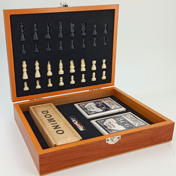 With this travel chess set, you can play chess, cards, dice, dominoes. 1 set include 4 games!