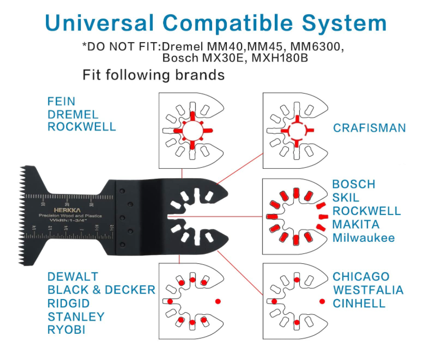 Universal Compatible System - Our quick release saw blades are compatible with many oscillating tools in the market, such as Fein Multimaster, Ryobi, Milwaukee, Hitachi, Black & Decker, Chicago, Craftsman, Dewalt and More.