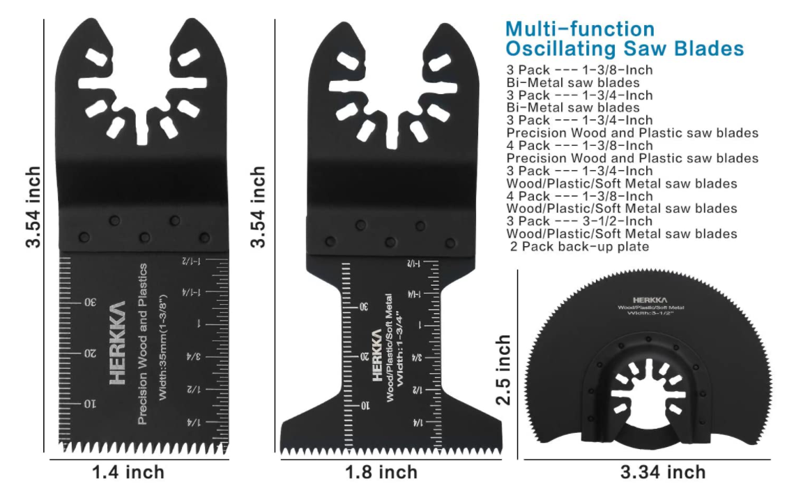 Set Includes - 27 PCS Oscillating Saw Blades set contain 7 different kinds of saw blades, 3 Pack 1-3/8-Inch and 3 Pack 1-3/4-Inch Wood and Metal saw blades, 3 Pack 1-3/4-Inch and 6 Pack 1-3/8-Inch Precision Wood and Plastic saw blades, 3 Pack 1-3/4-Inch, 4 Pack 1-3/8-Inch and 3 Pack 3-1/2-Inch Wood saw blades with 2 Pack back-up plate. Each type of saw blade is specific for a particular purpose.