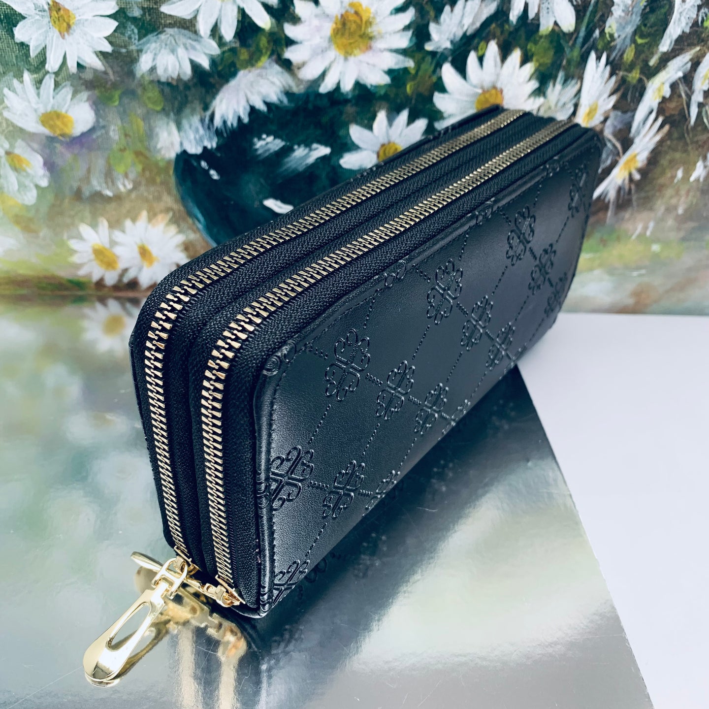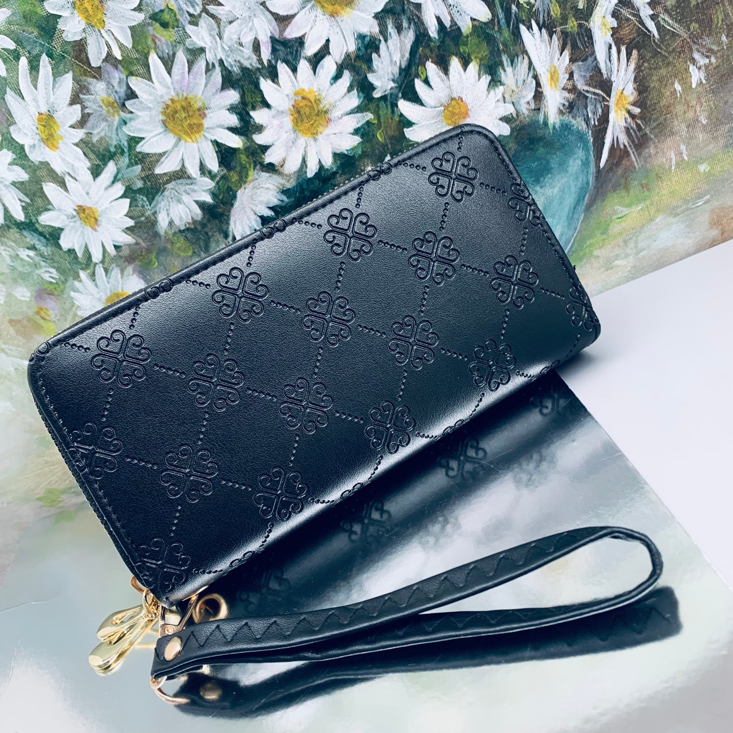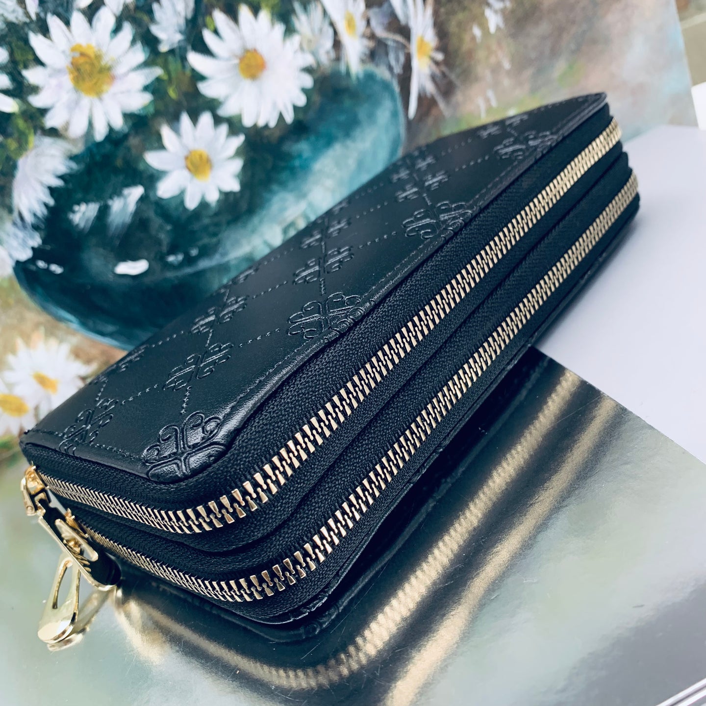*It has 8 card slots, 4 compartments, 1 zipper pocket, and 1 removable leather wristlet strap.