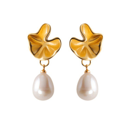 Embellique Gold Plated Brass with Natural Water Pearl Earrings Lotus Leaf Shape