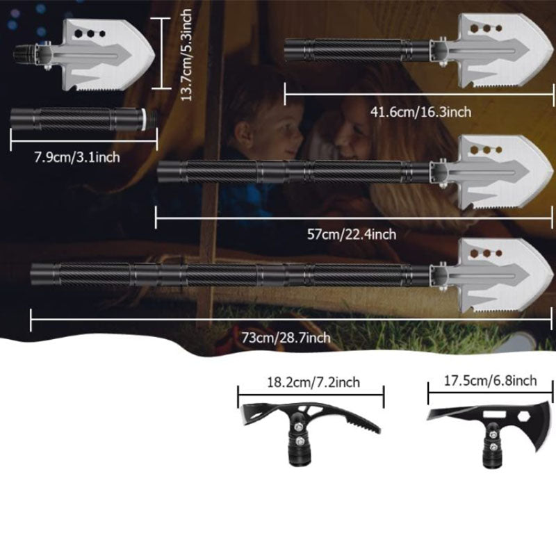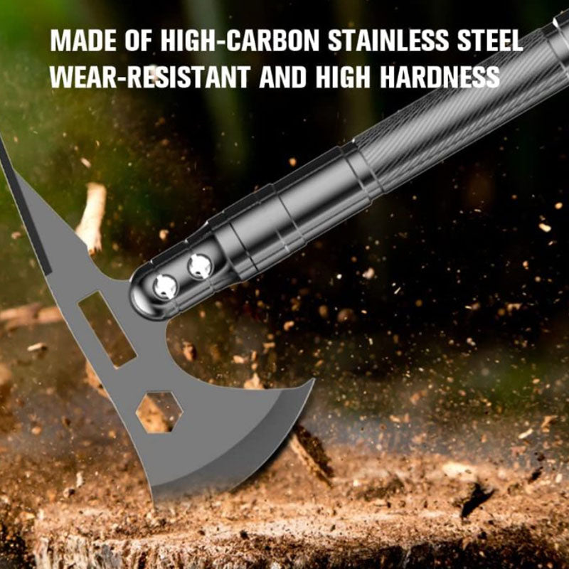The shovel and axe is made of high-quality thickened high-carbon steel, surface hardened and heat-treated. Hard enough, wear-resistant, rust-proof. Enough to deal with all kinds of outdoor adventures situations. shovel handle is made of military-grade thickened aviation aluminum alloy material, strong and lightweight. Comfortable grip.
