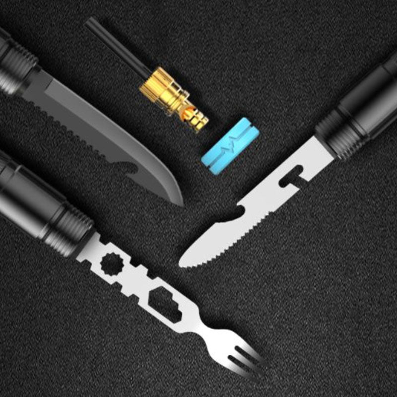 Folding camping survival shovel Axe Set includes shovel, axe, torch, Pick, Extension rod, knife, Western knife, fork, Whistle, flint, Attack cone, Compass, Glowing ring. Very suitable for chopping, shovelling, cutting, sawing, digging, mining, hammering, and bottle opening (torch not included).